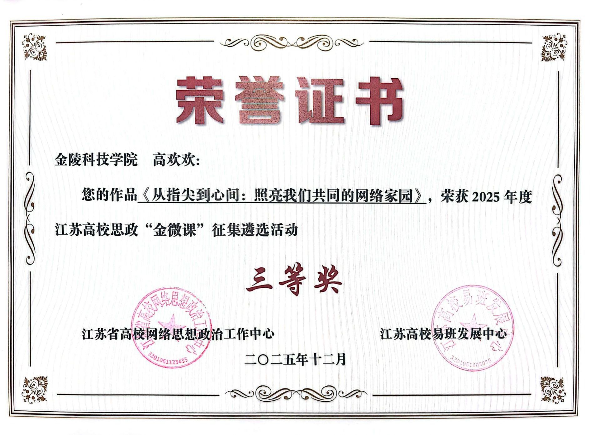 近日,2025年度江苏高校思政“金微课”征集遴选活动获奖名单揭晓,我校网络思想政治工作中心选送的两项作品获三等奖。网络育人名师“熠熠生辉”工作室负责人、学生工作处赵熠的《直面网络“超限战”,大学生不做“局外人”——透过“北京时间”网攻事件解读》获国家安全教育类三等奖,崇文工作室成员、人文学院高欢欢的《从指尖到心间:照亮我们共同的网络家园》获网络思想政治教育类三等奖。这是我校连续第二年在此项省级赛事中获奖,彰显了学校网络思政育人的扎实成效。